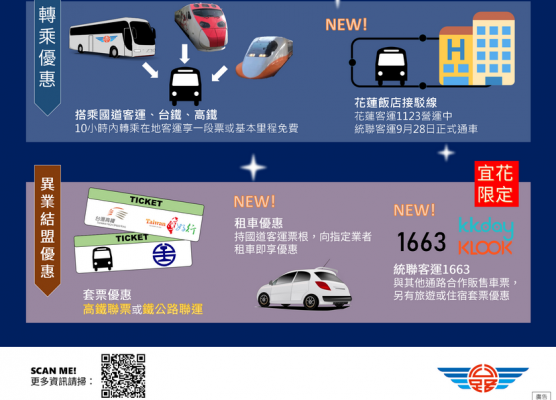 劉大川 / 公路總局將在中秋及國慶連續假期實施多項票價優惠措施,搭乘國道客運享票價85折或平日票價優惠、全票者持電子票證乘坐「台灣好行」路線享半價優惠,或於乘坐國道客運、高鐵或火車後「刷卡轉乘」當地客運有基本里程22元(或一段票)的免費優惠,及搭乘北花線相關異業結盟優惠,就是要鼓勵民眾多加利用大眾運輸工具。