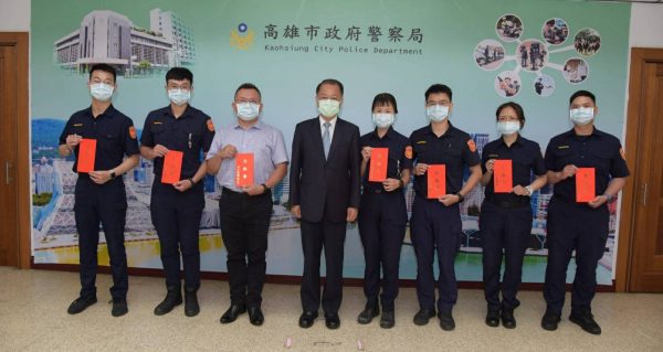 圖:黃明昭局長表揚好人好事事蹟員警,獲獎人為左營分局博愛四路派出所警員李俊明、仁武分局澄觀派出所警員黃閔歆、少年隊警員黃詩涵及頒發予三位退休人員紀念品,表彰市警局行政科科長張國讚、防治科科長翁榮華、民管中心主任潘誠章等三人。2022/06/30
